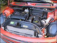 the Cooper Convertible's engine is not as powerful as the supercharged S, it still has decent get-up-and-go with zero to 100 km/h acceleration in 8.9 seconds. The Cooper Convertible sports the same engine as its hardtop sibling; a 1.6-liter, 16-valve, DOHC I-4 producing 115 horsepower at 6,000 rpm and 111 lb-ft of torque at 4,500 rpm. New for this year, the Cooper S engine boasts a little more power. Now the supercharged 1.6-liter, 16-valve, DOHC, I-4 produces 168 horsepower (instead of 163 hp) at 6,000 rpm but the torque stays the same at 155. With the engine upgrade its zero to 100 km/h acceleration time has changed from 7.2 to 7.0 seconds.