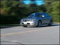 reduced considerably compared to last year's 2.0-litre unit. Already a very good setup, Subaru has also tweaked the WRX's suspension for '06. For starters, standard rubber is up an inch to 17, and there's a slightly quicker steering ratio. Like all of this year's Imprezas, the WRX benefits from electronic brake-force distribution (EBD) being added to the already standard ABS. Oh, and the brakes are slightly bigger with seemingly mandatory red exterior paint. For improved handling and traction, a viscous type limited slip rear diff has been added as well. After driving my WRX sedan test car for a week, it's safe to report that all of the improvements only add to the WRX's already excellent compromise between ride and handling. The generous wheel travel really makes a difference on our poorly maintained roads. A day spent exploring the new '06 WRX sedan on the back roads around the Mount Tremblant ski area north of Montréal confirmed that the WRX is as competent and poised over good pavement as well as bad. Of note: Turn ins are quick, and the new suspension upgrades add a sense of high-speed stability that the previous WRX lacked.