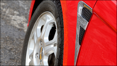 | On the outside, the fake air vents on the front fenders don't even try to look real. |