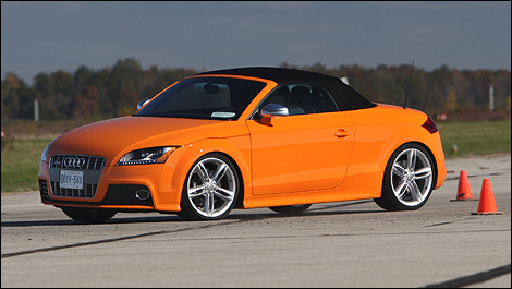 Yet on the road, the car's ride didn't pound us silly, although we didn't drive for very long and certainly weren't seeking badly-maintained roads. We'll keep this part of the evaluation for when we get the car during a regular road test. Note that the TT's Magnetic Ride adjustable shocks are standard-issue in the TTS. Sticker shock... maybeThe range-topping TTS starts at $57,600 for the 2+2 coupe and $61,900 for the 2-seat roadster. Options include 19-inch wheels, rear park assist, a navigation system and upgraded seating surfaces.  | | On the track, the car feels extremely capable, as its exhibits very little body roll. |