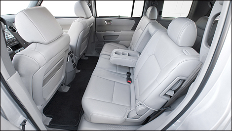 Along the sides there is a narrow impact strip to keep other doors out of your sheet metal. Basically it runs the distance between the wheel arches just like the tow generously cut doors do. Officially, the Pilot is a Cross-Over Utility Vehicle so it makes use of conventional doors front and back. At the rear is a very large and well-balanced rear hatch that on the touring model is power actuated.