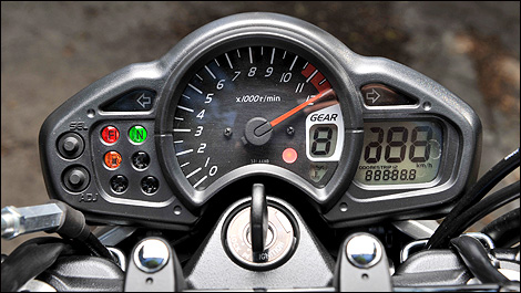 The easy-to-read instrument cluster features a gear indicator along with an analog tach, a digital speedometer and the usual idiot lights, but no fuel gauge. With no protection from the wind or the elements, the rider takes in the face and chest above 80 kph, and I would source a small windscreen to create my personal bubble of rain-free calm for touring, but not too big so that air can still circulate and keep me cool.