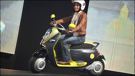 Scooter E Concept is driven by an electric motor that’s integrated to the rear wheel and fed by a compact lithium-ion battery. The Scooter can be plugged into any standard AC power outlet.