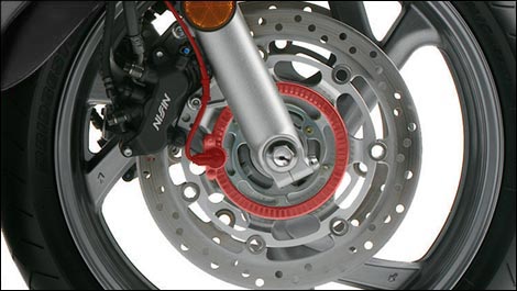 Things to avoidDuring a threshold braking maneuver, remember not to fully extend your arms or your capacity to steer properly will be affected. Also, you should never apply the front brake first, which would excessively -- and perhaps fatally -- increase the weight transfer to the front wheel. Because applying the rear brake first is not a natural reaction, you have to train beforehand. In addition, never downshift during an emergency braking maneuver, otherwise you will completely lose the engine braking force.  | | Front brake with an antilock system (highlighted in red). |
