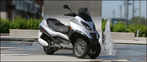 Riding a mid-range scooter to handle the daily commute proves to be an interesting answer to skyrocketing gas prices. That's what I've been doing, day and night, for the past seven years -- even with a suit and tie! In 2008, larger scooters are making a stronger presence than ever. Suburbanites will prefer 250-cc machines, which are lighter than motorcycles and also very nimble. They can ride on the highway and they command more respect from other road users. What's more, they're easier to park and offer better protection against the elements.  | | Piaggio MP3 |