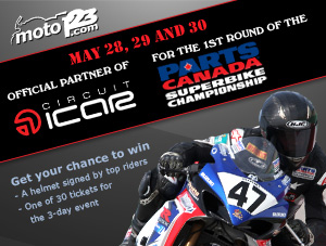By signing-up to our Moto123.com newsletter (Just go to the "Mailing List" window on the left side menu), your name is entered for a chance to win a Shark motorcycle helmet or one of 15 pairs of tickets (A $50 value) for the first round of the 2010 Parts Canada Superbike Championship, coming up at Circuit ICAR, near Mirabel, (QC) from May 28 to 30, 2010.