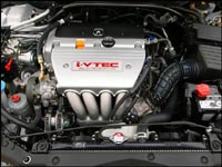 Le constructeur japonais, reconnu pour la beauté de ses moteurs, a intégré à la TSX un moteur 4 cylindres de 2.4 litres I-VTEC offrant 200 chevaux de puissance à 6 800 tr/mn. Comme les autres moteurs à calage variable des soupapes conçus par Honda, cette mécanique offre un très faible couple et affectionne les montées en régime près de la zone rouge. Afin d'exploiter la puissance disponible, il vous faudra donc pousser la voiture au-delà de 6 500 tr/mn et constamment rétrograder pour avoir droit à des reprises convenables. Si vous êtes de ceux qui apprécient ce type de mécanique, vous serez grandement satisfaits et aurez un jouet agréable d'utilisation. Afin de tirer parti de toute la puissance disponible, il vous faudra choisir la boîte manuelle à 6 rapports. Cette transmission très bien étagée à courts changements de rapports mérite d'ailleurs des éloges tant son utilisation est facile et d'une précision sans égale. Une boîte automatique à 5 rapports avec mode séquentiel est aussi offerte sans frais pour ceux qui recherchent une conduite plus calme. Cependant, sachez que le choix de cette transmission pondère grandement la puissance disponible. Il vous faudra en effet une seconde et demie de plus pour effectuer le 0-100 km/h par rapport à la boîte manuelle.