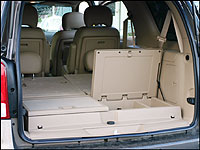 version allongée. Dans cette dernière, derrière la troisième rangée de sièges, on retrouve un compartiment utilitaire avec couvercle recouvert de tapis pour faciliter le chargement de n'importe quelle marchandise. La banquette arrière rabattable 50/50 est facile à manipuler même si l'alignement était laborieux pour faire un plancher plat. C'est un point agaçant, mais en déposant les bagages dessus, cette difficulté disparaît toute seule. Par ailleurs, les appuis-tête arrière n'ont pas besoin d'être enlevés lorsque les sièges sont rabaissés. On évite ainsi d'avoir des objets qui pourraient devenir de dangereux projectiles lors d'un accident.