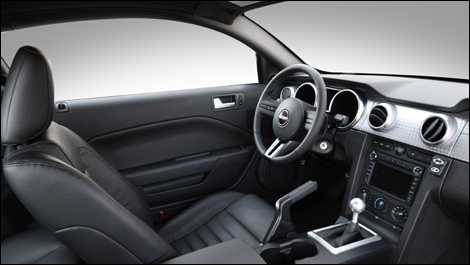 Habitacle tout aussi discretOn retrouve deux éléments type de la Bullitt, les cuirs noirs et le métal satiné ou brossé. Ford a ajouté une applique d'aluminium brossé et satiné à la planche de bord de la Mustang. Des cercles sertis d'aluminium encadrent les buses d'aération et les cadrans. Un bon mot pour les deux cadrans principaux : il est facile de repérer l'aiguille du compte-tours et de voir à quelle vitesse on roule grâce à des chiffres repères plus gros. Le réglage électrique du baquet sport confortable permet de trouver une très bonne position de conduite. Le levier de vitesses en aluminium brossé tombe bien dans la main. Les espaces de rangement sont toutefois très limités. Les sièges sont ceux de la Mustang Shelby GT500; ils sont donc plus enveloppants et dotés d'un meilleur maintien latéral. Les seuils de portières, lourdes et larges comme dans tout coupé, sont décorés d'une plaque en aluminium portant le sigle Bullitt.
