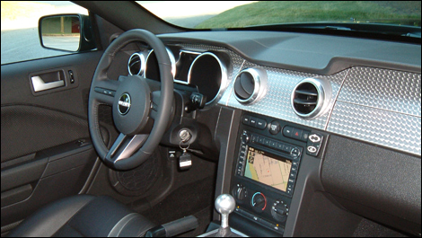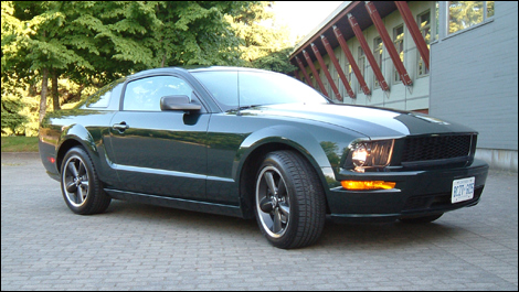 Normalement, je ne me serais pas extasié devant une voiture de la couleur de celle de Bullitt mais ici, le vert profond agencé aux jantes sport d'un gris fusain et les garnitures noires au fini mat confèrent une allure sobre qui laisse deviner beaucoup de performance. En fait, vous ne trouverez à l'extérieur du Bullitt aucun emblème à l'exception du logo ''Bullitt'' apposé sur le faux bouchon d'essence situé à l'arrière et du traditionnel petit cheval placé au centre des jantes.