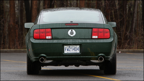 Davantage une 2 plus 2, la Mustang GT offre des places étroites à l'arrière. Par contre, le coffre permet de loger aisément ce qu'il faut pour le week-end. Mais attention, ne surchargez pas le coffre, car vous risquez de casser le plastique intérieur qui protège la serrure.  | | Les ingénieurs de Ford ont poussé la ligne rouge du moteur de 250 tr/min, ce qui permet des passages à 6000 tr/min. | Moteur, châssis et suspension retouchésTout comme en 2001, les ingénieurs de Ford ont pris soin de renforcer le châssis et la suspension de la GT pour s'assurer que la voiture s'adapte à la puissance (315 chevaux) et au couple (325 livres-pied) rehaussés du moteur ainsi qu'à l'accélération plus rapide de la voiture grâce au rapport de pont 3,73 : 1 spécifique à la version Bullitt. On a également poussé la ligne rouge du moteur de 250 tr/min, ce qui permet des passages à 6000 tr/min. J'ai atteint sur le deuxième rapport les 100 km/h en 5,7 secondes en utilisant le système d'antipatinage. Comme c'est le cas de toutes les Mustang GT, les passages de 1 à 2 et de 3 à 4 se font rapidement : mais il faut guider lentement le levier pour passer du deuxième au troisième rapport, sinon on risque d'entendre un crissement des rapports. Malgré cela, les dépassements de 80 à 120 km/h sont plus rapides si l'on utilise les deuxième et troisième rapports (3,8 s) que le troisième rapport seul (4,33 s). Au chapitre de la tenue de route, on ajouté une barre transversale reliant les tourelles d'amortisseurs avant pour donner au châssis une plus grande rigidité latérale et torsionnelle; des barres stabilisatrices de plus gros diamètre s'ajoutent aux amortisseurs et aux ressorts sport. La Bullitt porte son nomQuand on tourne la clef, et que le moteur démarre, la magie s'allume... à ne pas en croire ses oreilles. On reconnaît la sonorité sourde si distinctive des V-8, mais avec un brin de base tout à fait unique au moteur de la Mustang Bullitt d'origine. Les ingénieurs ont concocté un système d'échappement double propre à la version Bullitt.  | | Les ingénieurs ont concocté un système d'échappement double propre à la version Bullitt.