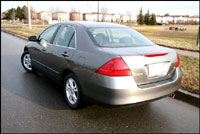 battre, puisqu'elle offre les glaces et les rétroviseurs à commande électrique, le télédéverrouillage, les freins ABS, ainsi que des coussins et des rideaux latéraux gonflables pour 2800$ de moins. Vous ne pouvez endurer ce gris? Vous pouvez choisir la EX à quatre cylindres de niveau supérieur, et la liste sera augmentée, avec du cuir, et un choix de garniture en bois ou en alliage, la climatisation bizone, et un changeur de six disques compacts parmi les autres caractéristiques disponibles. Mettez un peu plus d'argent sur votre Accord et vous pourrez passer au moteur V6 de 244 chevaux, et obtiendrez le contrôle de stabilité VSA, ainsi que l'option d'un système de navigation à commande vocale. Et n'oublions pas l'hybride, qui est à la fois l'Accord la plus rapide et la plus économe, et vous pourrez à tout le moins récupérer une partie de votre investissement en économies d'essence. Mais à part être l'héroïne que des dizaines de milliers de canadiens  | | L'Accord redessinée continue d'établir la norme, même avec plusieurs nouvelles arrivantes. (Photo: Justin Couture, Canadian Auto Press) |