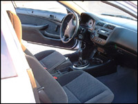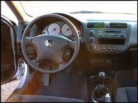 À l'intérieur, toutes les commandes sont simples à utiliser et facile d'accès. Il y a trois gros boutons pour contrôler la direction de l'air, la température ainsi que la vitesse du ventilateur. Cela ne pourrait être plus facile à utiliser. Le lecteur de CD a une bonne sonorité malgré qu'il n'y ait que 4 haut-parleurs, et il est placé haut sur le tableau de bord. Un bon vieux bouton rotatif contrôle le volume. Il y a davantage de basses que les systèmes de son installés dans les modèles bas de gamme précédents de Honda et Acura. Le tableau de bord et les panneaux de porte sont, par contre, tous de couleur noire et contribue à rendre l'habitacle monotone. Les cadrans gris avec aiguilles rouges sont faciles à lire le jour et projettent une lueur orange durant la nuit.