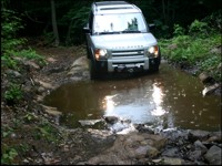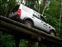 Certaines flaques s'étaient étendues assez pour être qualifiées de mares et même d'étangs mais, comme tous les obstacles précédents, le LR3 a passé outre sans trop se fatiguer. Nous avons ensuite traversé une série de ponts de bois, certains servant de support au-dessus de marécages et d'autres, plutôt élevés, nous permettant de franchir des ravins. La pluie, encore une fois, avait rendu la surface très glissante, mais le fait de circuler tranquillement et prudemment, avec les miroirs bien ajustés pour refléter les pneus arrière, nous a garanti des traversées sécuritaires.