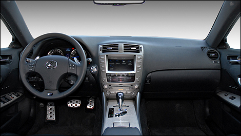 L'intérieur est beau, mais un peu massif, ce qui lui enlève du raffinement. Le souci du détail est purement Lexus. Comme il s'agit d'une version sportive, on oublie les boiseries fines et on s'attaque à l'aluminium. Les sièges sont contrastants en cuir noir et blanc. Et pour vous rappeler que vous avez payé pour la version sportive, une infinité de petit F meuble l'habitacle.