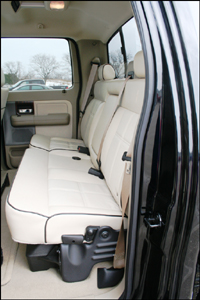 Comme les autres, ils furent impressionnés par le chrome, les sièges en cuir de couleur crème, et particulièrement par le système de divertissement à DVD pour les passagers à l'arrière, monté au pavillon sur un système de rails. Mais ils furent très malheureux que je n'aie aucun DVD sous la main... Que puis-je dire, je ne passe pas beaucoup de temps à visionner des films assis à l'arrière d'un camion, quoique j'aurais bien pu, puisqu'il y a presque autant d'espace que dans mon salon. C'est un habitacle qui peut réellement accommoder cinq adultes, avec seulement deux places à l'avant, à cause de l'énorme console centrale. Aussi pratique que puisse être le système de rails du pavillon, j'ai surtout utilisé le compartiment de rangement escamotable, qui était idéal pour mes lunettes de soleil.
