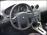 Je devrais tout de suite mentionner que, si les matériaux de plus grande qualité sont appréciés, l'ergonomie et le fini de la G6 s'avèrent tout aussi impressionnants. Toutes les surfaces intérieures s'unissent avec une précision et un alignement quasi parfaits. La disposition du tableau de bord est simple et rafraîchissante, bien loin du look prétentieux et sensationnaliste d'un grand nombre de Pontiac. En version pré-production, le noir règne sur toute la ligne, y compris les sorties d'air circulaires qui se ferment complètement lorsqu'on ne les utilise pas. La thématique des bordures chromées se retrouve également sur les cadrans, toujours de façon sobre et efficace. La console centrale est elle aussi simpliste. La version de base ne comporte qu'une interface à un CD tandis que la version GT comprend un bloc audio Monsoon à six CD. De simples contrôles à trois touches pour la chaufferette, la ventilation et l'air climatisé sont positionnés en dessous, à la grande portée du conducteur et du passager avant.