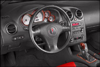 jazz up the interior for a sportier feel, the G6 GXP features new copper-coloured accent trim on the centre console and shift-knob. More of the reddish-orange chrome trim highlights the instrument cluster and door controls. This brightly-coloured trim is also featured on the seat edges and door panel inserts.