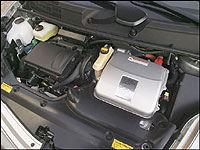La puissance de ce véhicule à très faible taux d'émission (SULEV, pour Super Ultra Low Emissions Vehicle) provient, comme je l'ai mentionné, d'un moteur à essence et d'un moteur électrique. Le moteur à essence est un 4 cylindres à 16 soupapes, à DACT et à cycle Atkinson, de 1,5 litres, qui produit 76 chevaux à 5000 tours-minute et 82 livres-pied de couple à 4200 tours-minute. Comme toutes les autres Toyota, il est équipé du système intelligent de calage variable des soupapes (VVT-i pour Variable Valve Timing with Intelligence) qui optimise le rendement tout au long de la courbe de puissance. La transmission électronique continuellement variable, intégrée au système HSD, n'a pas de rapports d'engrenages fixes, mais procure plutôt un rapport infiniment variable qui s'ajuste selon les conditions de conduite et la position de l'accélérateur.