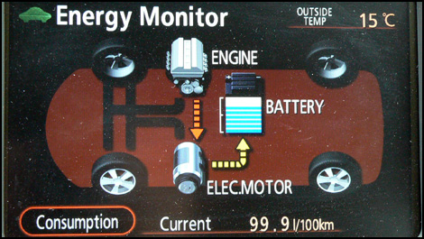 | La Prius comprend un écran ACL qui affiche le fonctionnement de la motorisation hybride. |