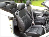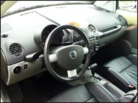À l'intérieur, mis à part certains changements nécessaires à la confection du cabriolet, les habitués de la New Beetle n'y verront probablement que du feu. Tous les éléments stylistiques du tableau de bord sont parfaitement identiques, avec son bloc de cadrans indicateurs circulaire, son indéfiniment profonde planche de bord et son désolant lecteur de cassettes. L'éclairage bleuté de la planche de bord agrémente l'ambiance tandis que les matériaux de qualité et de bon goût donnent un aspect unique à l'habitacle. Malheureusement, l'ergonomie n'est pas la principale qualité de l'habitacle de la New Beetle. Après avoir noté l'absence d'un indicateur de température du moteur, le conducteur jubilera contre les porte-gobelets mal foutus, les espaces de rangement pratiquement absents et les ceintures de sécurité qui vous coupent pratiquement le cou.