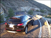 The shifter was especially appreciated when Phoenix, Arizona's flat, grid-like roads began to curve on the way up to South Mountain Park's lofty summit. The roadway is narrow, twisting and undulating, a perfect stage to work a little front-midship (FM) Infiniti magic - incidentally the FX shares its rigid platform with the best in class G35 sedan and coupe. One hairpin corner after another, the FX45's standard 20-inch rims (the FX35 gets standard 18s and optional 20s) deliver flat, predictable handling like no other SUV I've ever tested, aided by a wonderfully sorted Vehicle Dynamic Control (VDC) and Traction Control System (TCS) that keeps the rear end perfectly in check without spoiling the party. Electronic systems continue through to the brakes of course, where 4-wheel discs are assisted by a sophisticated anti-lock system that includes electronic brake force distribution and brake assist, capable of pulling the SUV down from lightning speeds to immobility in seconds while keeping complete composure all the way to full stop.