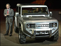 | Ford Motor Company VP of Design J Mays introduces the Ford Bronco Concept Sunday January 4, 2004 at the North American International Auto Show in Detroit, Michigan. (Photo: Ford Motor Company) |