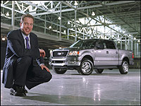 | Bill Ford Jr., Chairman and CEO of Ford Motor Co., poses with a 2004 Ford F-150 SuperCrew 4x4 inside the yet to be completed Dearborn (Mich.) Truck Plant in this publicity shot. This is Ford's newest assembly plant and will be going online in 2004 to make the company's No. 1 best selling vehicle. (Photo: Ford Motor Company) |