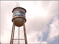 | Ford again makes its presence known around San Antonio, even by posting its blue oval atop this water tower in Gruene, a popular tourist destination. (Photo: Joe Cabadas, Canadian Auto Press) |
