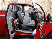 The 2004 F-150 offers three cab choices, all with four doors. The Regular Cab has a single row of seats, while the rearward-swinging access doors reveal a behind-seat stowage area up to 13 inches deep. The SuperCab also has rearward swinging doors to access the second row seating area, along with optional rear door power windows and an optional power sliding rear window. And, the SuperCrew has two rows of seats and four forward-swinging full-size doors.