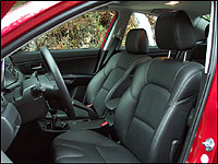 cool backlit orange buttons and trim, one of the best integrated audio system interfaces on the planet or its motorcycle-style tri-binnacle gauge cluster. My $23,000-something tester featured better-than-average quality leather seats and trim, high-tech aluminum accents, plus a sweet looking faux-carbon-fiber dash insert. I'd say it's the BMW of economy cars, but Mazda's 3 goes further than the Bavarian by offering a dash-mounted 6-disc CD changer in anything over the base model. What's more, the tilt and telescoping steering wheel features audio/cruise buttons on its spokes.