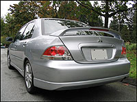 car buff at 12 years-old said, "I like it, but it looks just like every other sedan on the road." He's right. This could work for or against the Lancer. Its modest good looks and generic curves allow it to appeal to all generations in an inoffensive way. That behind us, I would have liked a little more flare. The color-keyed front, side and rear body ground effects with rear spoiler and stainless steel exhaust did make it sporty, but the wimpy 'Ralliart' badge pasted to the rear hardly shows off its many endearing qualities. Perhaps a distinctive color specifically designed for this trim, like the MazdaSpeed Protegé's Titanium Gray or Blazing Yellow would have had my motor revving a little higher, and maybe even some more badging on the sides would have helped.