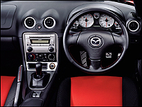 Inside, black leather with red stitching covers the steering wheel, shift knob and handbrake lever, color-matched to the black and red cloth seats. A familiar Miata instrument cluster features silver-face gauges and the MazdaSpeed logo, which also appears on the foot pedals, rocker plates, floor mats and body-color rearview mirror cap.