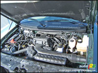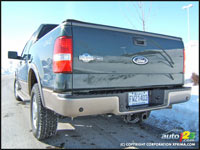hp at 4 350 rpm and 260 lb/ft of torque at 3 750 rpm. The next one is the 4.6L V8 found in many Ford vehicles. It directs 231 hp at 4 750 rpm and 293 lb/ft of torque at 3 500 rpm to the wheels. The final power train consists of the 5.4L V8 putting out 300 hp at 4 750 rpm and 365 lb/ft of torque at 3 750 rpm. Both V8s can be had with all body styles. Transmission-wise, the V6 has the option of a 5-speed manual or a 4-speed automatic. Only the 4-speed automatic can be mated to the V8s. Four big discs, to handle braking duty and 17" wheels are standard on all F-150s. The tested King Ranch was shod with 18" aluminium alloy wheels.