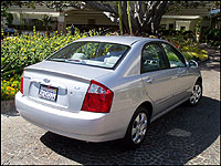 That beltline isn't the only attractive element to the Spectra's design when viewed from behind, as its rear decklid is also nicely executed. The trunklid includes a slick integrated spoiler at its rearmost edge, which arcs gracefully from center to each side tucking in just above the large, upscale taillamps. Kia has added a few chrome accents to key focal points, such as the license plate surround, giving it a classy touch.