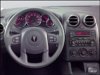 My first glance at the interior has me thinking that it's an improvement over the norm. Still there's no denying its Pontiac roots, highlighted by all too familiar organic shapes. It's not particularly innovative, and doesn't set any new standards. The thick-rimmed leather-wrapped steering wheel matches up with the racy look of chromed porthole air vents and sporty instrument cluster. Pontiac calls the lighting theme "True-Red," but these images portray the scheme as pink. A little weird, but whatever goes.