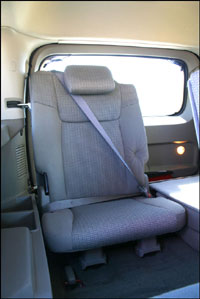 the seating in the back row is a little tight. That being said one of the best things about the seating is that it is stadium style, meaning that each row is slightly higher than the one in front, so every one gets a great view whether it is of the road ahead or of the DVD screen. The two back rows of seats fold up and down easily as well. A simple tug on the lever allowed the seat to disappear into the floor, making the transition quick and painless. What's more, the cathedral-like roof allows for plenty of headroom for all.