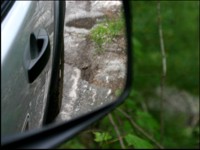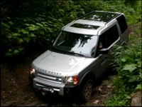 alarming incline, a large tree planted right on the edge of the roadway, on the inside where it could easily tear a less attractive window into the LR3's passenger compartment, I truly hesitated, a lump forming in my throat and deep concern over damaging this top-line Land Rover, let alone any personal body parts, on my mind. Refocusing, I gave way to gravity, inching ever so carefully downward, keeping an eye on the right-side mirror, which was canted downward so that I could pay attention to the outside rear tire in its quest to find the rightmost edge of the road, left-side mirror canted upward to where the thick tree was ominously towing overhead, leaning out over the road and just narrowly missing the upper portion of the LR3's body structure, paint fortunately still glistening, sheetmetal unmolested and windows still fixed in place, knowing that a slip of my throttle, brake combination might cause a slide either way, popping the right rear wheel off of its track and into never land, or