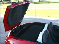 On the positive, the clamshell trunk nullifies the need for an awkward, clumsy tonneau cover, the likes of Toyota's Solara convertible or even more cumbersome, Volkswagen's New Beetle Convertible. Simply raise the rear decklid and plop the ragtop out of sight, lower the decklid and you're off to the races. That said, you need to get out of the car to do this, which makes dropping the top at a stoplight out of the question. The MX-5's top, for instance, is much easier to stow away and raise up again, only requiring one hand/arm combination and a little muscle while sitting in the car to do either job.