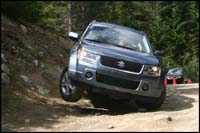 quickly became apparent. It allows the option to lock the centre differential in either 4 HI or 4 LO modes, which allowed for greater traction even if its lowest gear ratio wasn't engaged. But once bull-low is chosen, only its 200 mm (7.9 in) ground clearance can hang it up. While there weren't any obstacles on the light- to medium-duty road Suzuki had chosen for our 4x4 run that were tough enough to truly test the GV's mettle, I recently had a Jeep Liberty on some harrowing trails. Why the comparison? Well, both models arrive at the dealer with identical ground clearance.The Jeep, which is "Trail Rated", or in Jeep-speak, good enough to traverse the Rubicon Trail, was capable  | | With the Grand Vitara the skid-plates underneath are plastic, so the protection offered is only moderate. (Photo: Trevor Hofmann, Canadian Auto Press) |