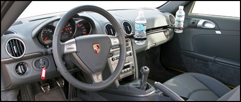 Comfortable and quiet What I liked the most was the quietness of the base Cayman compared to the brawnier S. Occupants can revel in listening to the great audio system without being bothered by the engine sound. Between 110 and 130 km/h, the mill smoothly purrs in fifth gear. Oddly, the Michelin Alpin tires were super quiet on a rain-soaked surface but noisy on a dry, concrete road. A compromise is hard to find. The layout of the various gauges and controls is still a benchmark in my book. I found the interior storage to be convenient and well thought out, except for the door pockets. That said, there are two functional trunks to store your luggage. | | The cockpit offers exemplary ergonomics. | Delicate visibilityI highlighted this point when I reviewed the Cayman S and the base Cayman is no different. Actually, I would say that visibility is the car's Achilles' heel. I made a two-way trip from Laval to Quebec City on Highway 40 with a constant rain and 0 to -2oC temperatures. In such weather conditions, the road was obviously full of calcium and sludge, which created quite a filthy mix. In less than 200 kilometres, the windows and sideview mirrors got dirty to the point where visibility was a serious issue. The driver has to be more careful than usual before changing lanes. Turbulence forces water back and sprays it directly onto the sideview mirrors and the front portion of the side windows. This problem is not insurmountable, but Porsche's engineers will have to figure out a solution quickly. An improved water-derivation system around the windshield would surely help.  | | Lateral visibility is impeded by road grime on the windows. | Fuel-efficient sports carMartin Constien, Chief engineer at Porsche, spoke highly of the fuel economy of the new engines powering the Boxster and Cayman. I was understandably suspicious at first, but he was right: I averaged 10 L/100 km during my trip to Quebec City and back. Sure, I mostly drove on the highway at an average speed of 119 km/h, but I started and finished in both places during rush hours. In order to verify what the on-board computer indicated, I did my own calculation and came up with 9.9 L/100 km over 420 kilometres and 10.49 L/100 km over 430 kilometres. Congratulations, Mr. Constien, these numbers are reasons to be proud! In city traffic or sporty driving, the fuel consumption will likely increase to 15 L/100 km if you push hard.