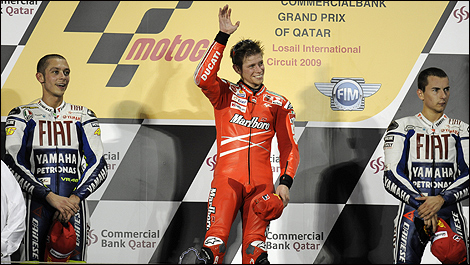 After torrential rain postponed the presentation of the MotoGP season opener in Qatar to Monday, Ducati team leader Casey Stoner completed a perfect week-end by dominating every practice and qualifying session, and leading the race from flag to flag.