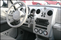 L'intérieur de l'ancienne PT avait beau être rétro, mais celui de la nouvelle PT l'est juste ce qu'il faut, et ce non seulement d'une perspective visuelle ou de la qualité. Le nouveau bloc central rectangulaire au fini argent satiné électroplaqué est beaucoup mieux organisé, plaçant la radio au-dessus des commandes du système de chauffage - là où elles auraient dû être placées dès le début. Les commandes des glaces électriques demeurent au sommet du tableau, où une horloge analogique, empruntée à la 300, leur tient compagnie, avec une paire de bouches de ventilation en forme de "boule à 360 degrés". Les puits d'instruments sont nouveaux, aussi, agrandis pour faire place aux cadrans à façade blanche au look exquis, ainsi qu'à l'ordinateur de voyage numérique EVIC de Chrysler. D'un point de vue pratique, la PT porte également des porte-gobelets révisés, un nouveau range-monnaie et deux prises de 12 volts.