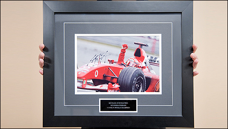 A certificate from Formula World Shop that testifies the authenticity of Michael Schumacher's signature will accompany the framed photo.