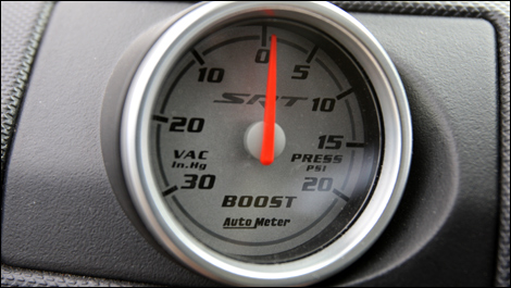 | À gauche du volant, un gros cadran circulaire donne la pression du turbocompresseur. Cet accessoire fait beaucoup jaser ! |