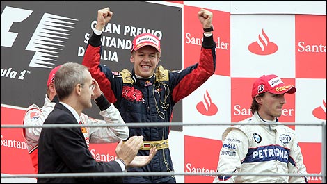 Hier, à l'occasion du Grand Prix d'Italie à Monza, le pilote allemand Sebastian Vettel est devenu le plus jeune pilote à remporter une victoire en Formule 1, battant le record qui appartenait à Fernando Alonso. Vettel, né le 3 juillet 1987, a commencé sa carrière en Formule 1 l'an dernier, chez BMW-Sauber en remplacement de Robert Kubica qui s'était blessé à Montréal. Notons aussi qu'il s'agissait de la première victoire pour la petite écurie Toro Rosso de Faenza en Italie. Toro Rosso est née de la structure de Minardi, l'équipe fondée par Giancarlo Minardi en 1972. Minardi a effectué ses débuts en F1 en 1985. Cliquez sur le lien qui apparaît ci-haut pour voir les photos de cet exploit. Photos : WRI2
