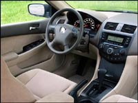 Si le style de la carrosserie m'a laissé sur mon appétit, il en va tout autrement pour ce qui est de l'habitacle. Les couleurs contrastantes, le dessin de la partie centrale de la planche de bord et l'éclairage des instruments d'un blanc vif m'ont rapidement séduit. C'est définitivement en prenant place à bord de l'Accord qu'on réalise les améliorations apportées à cette septième génération. D'abord, vous prendrez place sur des sièges judicieusement dessinés qui offrent un confort, une fermeté et un soutien remarquable. De plus, les multiples ajustements des sièges et du volant vous aideront à trouver rapidement une position de conduite idéale. Le bloc central qui comprend les commandes du système audio et du système de chauffage/ventilation est bien positionné et simple à comprendre. De plus, le passager bénéficie cette année sur la version EX-L d'un contrôle automatique de température indépendant. Notre modèle d'essai (justement une EX-L) était muni de plusieurs accessoires de luxe tel la sellerie de cuir, les sièges avant chauffants, le toit ouvrant, la chaîne audio avec chargeur de 6 CD, les jantes en alliage de 16 pouces et plus encore. Une version DX est peut-être moins mirifique mais demeure tout de même un choix judicieux. Il est évidemment inutile de parler de la qualité de finition et des matériaux qui sont toujours aussi fidèles à la réputation du constructeur.