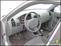 Au niveau de l'équipement, l'Accent5 offre un minimum d'accessoires. On y retrouve tout de même un volant inclinable, des essuie-glace à balayage intermittent variable, un essuie/lave-glace de lunette arrière, un tachymètre et une radio avec lecteur CD/MP3, dont la sonorité est loin d'être envoûtante. Il m'a cependant semblé ridicule de retrouver un miroir de courtoisie uniquement du côté conducteur, lorsqu'on sait que de se maquiller au volant est aussi dangereux que de déjeuner, se raser ou encore converser au téléphone cellulaire. Ceux qui désirent un peu plus de « luxe » pourront, pour la modique somme de 1300 $, obtenir un groupe d'options incluant les lève-glaces, le verrouillage et les rétroviseurs à commande électrique, ainsi que le télédéverrouillage et le climatiseur.