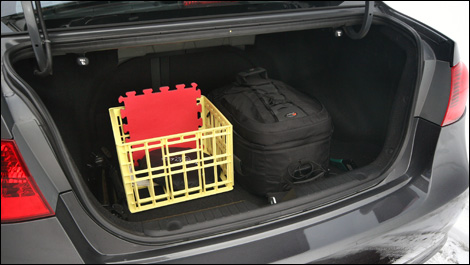 Les sièges baquets (chauffants) sont amples et misent sur le confort. Derrière, la banquette est assez spacieuse pour deux adultes ou trois enfants. Enfin, le coffre est modulable grâce à des dossiers asymétriques (40/60) rabattables. Soulignons que son volume de chargement (402 litres) est le plus important de sa catégorie.  | | Le coffre de l'Elantra est le plus volumineux de cette catégorie de voitures. |