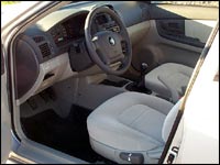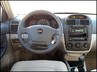 En ouvrant la portière, la Spectra déçoit au premier coup d'oeil. L'habitacle est loin d'être mal conçu, mais le design de la planche de bord manque franchement d'originalité et les couleurs utilisées donnent un aspect à la fois morbide et bon marché. Il faut dire que j'ai personnellement une allergie aux voitures de couleur gris argent avec intérieur gris, sans doute parce que ces couleurs représentent à peu près 20 % de ce qui se vend actuellement et que les routes du Québec en sont parsemées.